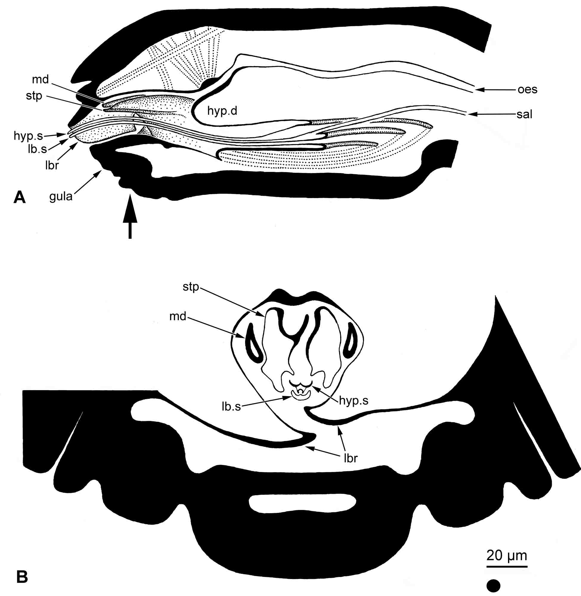 Ðèñ. 9.3.3. Siphunculata: Hybophthirus orycteropodi Enderlein 1909 (ïî ðèñóíêàì èç Keler 1962). A – ïðîäîëüíûé ðàçðåç ãîëîâû, ñõåìàòèçèðîâàíî; ëàáèàëüíûé è ãèïîôàðèíãåàëüíûé ñòèëåòû ïîêàçàíû òîëùå, ÷åì îíè åñòü (ïóíêòèðíîé ëèíèåé ïîêàçàíû ìûøöû, ÷åðíûì – ñðåç êóòèêóëû, ïóíêòèðîâêîé – ïîâåðõíîñòè çà ïðåäåëàìè ñðåçà; ñòðåëêîé ïîêàçàíî ìåñòî ñðåçà íà ðèñ. B). B – ïîïåðå÷íûé ðàçðåç âåíòðàëüíîé ÷àñòè ãîëîâû íà óðîâíå, ïîêàçàííîì ñòðåëêîé íà ðèñ. A (÷åðíûì ïîêàçàí ñðåç êóòèêóëû). Óñëîâíûå îáîçíà÷åíèÿ: cly – êëèïåóñ; hyp.d – äîðñàëüíàÿ äîëÿ ãèïîôàðèíêñà; hyp.s – ãèïîôàðèíãåàëüíûé ñòèëåò; lbr – âåðõíÿÿ ãóáà; lb.s – ëàáèàëüíûé ñòèëåò; lb.v – âåíòðàëüíàÿ äîëÿ íèæíåé ãóáû; md – ìàíäèáóëà; oes – ïèùåâîä; sal – íåïàðíûé ïðîòîê ëàáèàëüíîé (ñëþííîé) æåëåçû; stp – ñòèïåñ ìàêñèëëû. Ïîä ìàñøòàáíîé ëèíèåé (20 μm) ïîêàçàí äèàìåòð ýðèòðîöèòà (7 μm).
