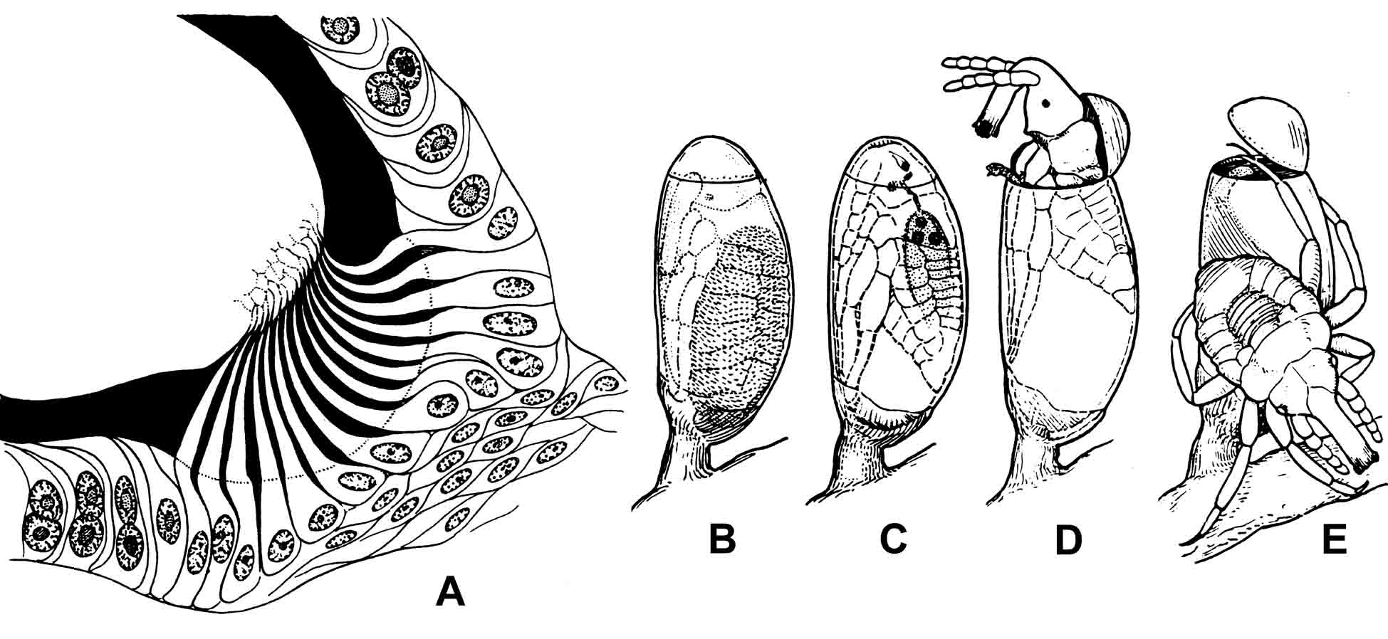 Ðèñ. 9.3.5. Rhyncophthirina: Haematomyzus elephantis Piaget 1869, ÿéöî (ïî Weber 1969, óïðîùåíî). A – ðàçðåç çàäíåé ÷àñòè ÿéöà, íàõîäÿùåãîñÿ â ÿè÷íèêå è îêðóæåííîãî êëåòêàìè ôîëëèêóëà (õîðèîí ÿéöà ïîêàçàí ÷åðíûì); B–E – ïîñëåäîâàòåëüíûå ýòàïû âûëóïëåíèÿ ëè÷èíêè èç ÿéöà.