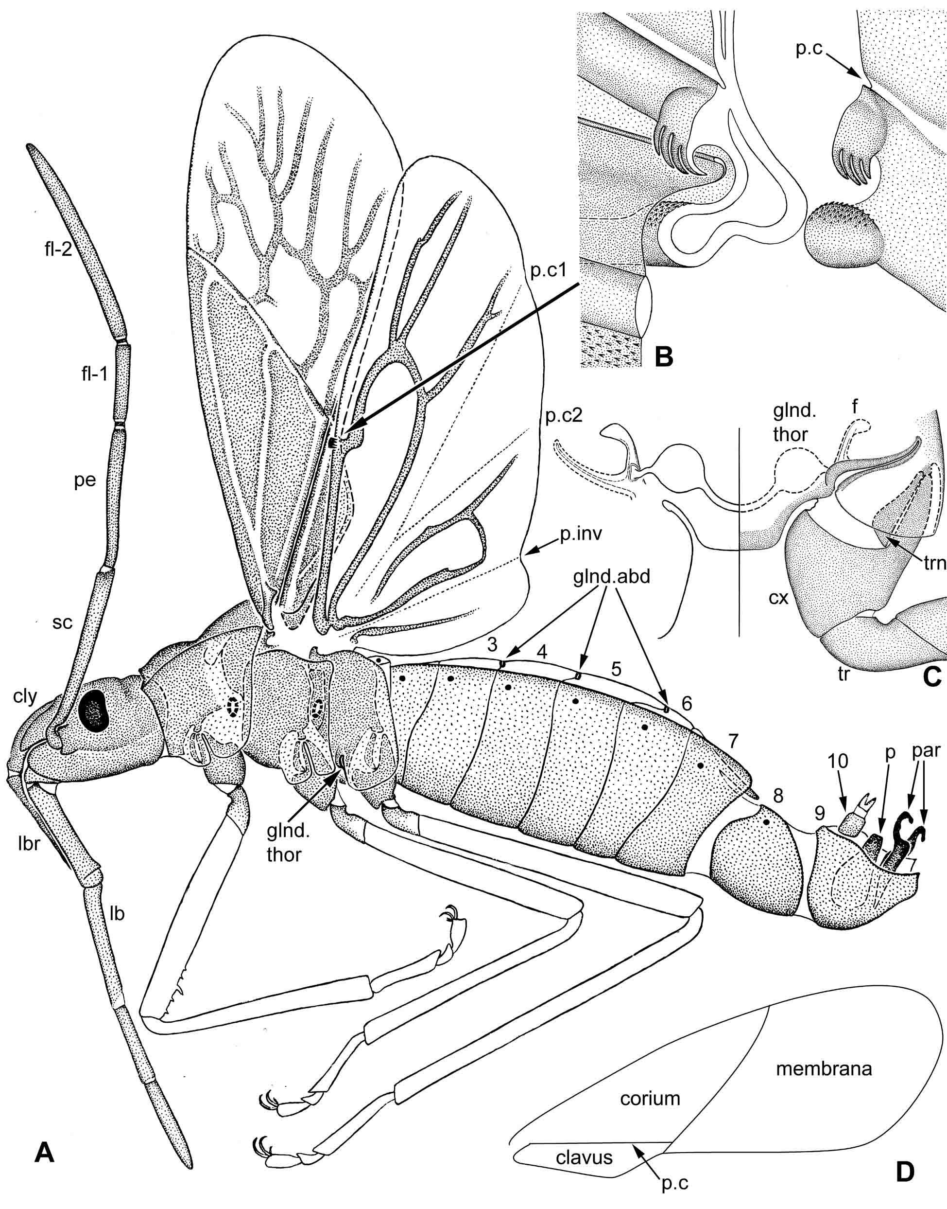 Ðèñ. 9.8.2. Heteroptera: Dysderus imitator Blöte 1931. A – ñàìåö èìàãî, ëàòåðàëüíî; B – ñöåïêà ïðàâûõ ïåðåäíåãî è çàäíåãî êðûëüåâ, äîðñàëüíî (êðûëüÿ ñðåçàíû ïîïåðåê íà óðîâíå ñöåïêè, äèñòàëüíàÿ ÷àñòü çàäíåãî êðûëà óäàëåíà); C – âåíòðàëüíàÿ ÷àñòü çàäíåãðóäè (ñëåâà ïîïåðå÷íûé ðàçðåç ÷åðåç ïàõó÷óþ æåëåçó è åå ïðîòîêè; ñïðàâà âèä ñïåðåäè); D – íàçâàíèÿ ïîëåé ïåðåäíåãî êðûëà. Óñëîâíûå îáîçíà÷åíèÿ: 1–10 – òåðãèòû I–X ñåãìåíòîâ áðþøêà; cly – íàëè÷íèê; cx – òàçèê; f – ñòåðíàëüíàÿ àïîäåìà; fl-1 – áàçèôëàãåëëóì; fl-2 – äèñòèôëàãåëëóì; glnd.abd – îòâåðñòèÿ àáäîìèíàëüíûõ ïàõó÷èõ æåëåç; glnd.thor – òîðàêàëüíàÿ ïàõó÷àÿ æåëåçà; lb – íèæíÿÿ ãóáà (âíåøíèé õîáîòîê); lbr – âåðõíÿÿ ãóáà; p – ïåíèñ; par – ëåâûé è ïðàâûé ïàðàìåðû; p.c – êëàâàëüíàÿ áîðîçäà; pe – ïåäèöåëëóñ; p.inv – èíâåðòàëÿðíàÿ ñêëàäêà; sc – ñêàïóñ; tr – âåðòëóã; trn – òðîõàíòèí.