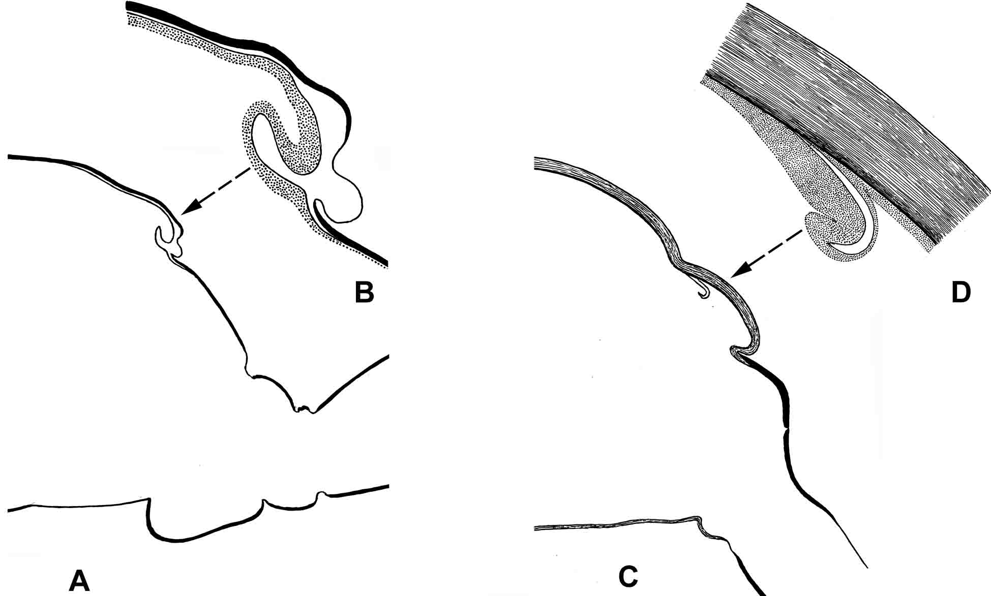 Рис. 10.1.3. Поперечный срез правой половины заднегруди: A–B – молодая личинка веснянки Nemoura sp. с зачатком протоптерона; C–D – личинки предпоследнего возраста ручейника Rhyacophyla nubila с внутренним зачатком протоптерона.