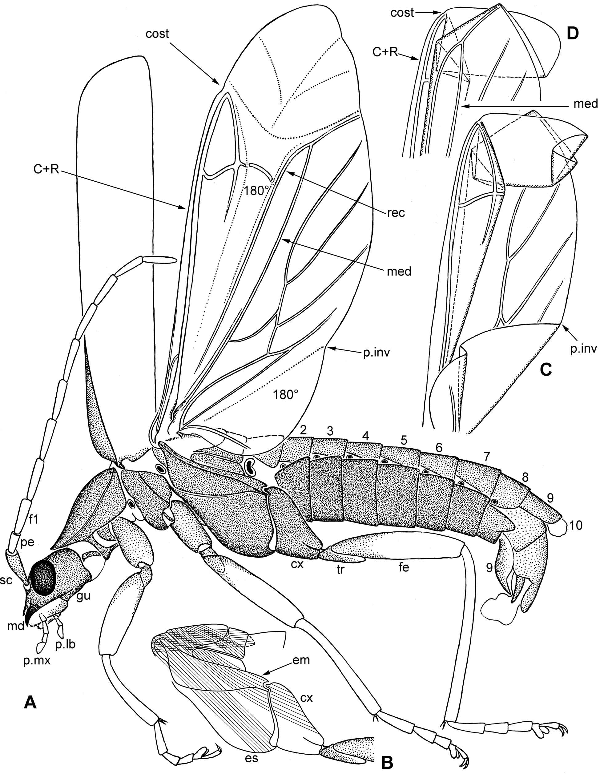 Ðèñ. 10.2.3. Eleuterata-Polyphaga: Rhagonycha fulva (Scopoli 1763 [Cantharis]). A – ñàìåö ëàòåðàëüíî (ñì. ðèñ. 10.2.4); B – ïåðåêðåñòíàÿ êðûëîâàÿ ìóñêóëàòóðà çàäíåãðóäè; C – ëåâîå çàäíåå êðûëî â ñëîæåííîì ñîñòîÿíèè (âåíòðàëüíî, êàê íà ðèñ. A); D – âåðøèíà ïðàâîãî çàäíåãî êðûëà â ñëîæåííîì ñîñòîÿíèè, äîðñàëüíî. Óñëîâíûå îáîçíà÷åíèÿ: 180° – îáëàñòè çàäíåãî êðûëà, êîòîðûå ïðè ñêëàäûâàíèè ïåðåâîðà÷èâàþòñÿ íà 180°; 2–10 – ñåãìåíòû áðþøêà; C+R – ïåðåäíÿÿ ïëàíêà çàäíåãî êðûëà (îáðàçîâàíà æèëêàìè C, Sc è RA); cost – êîñòàëüíûé øàðíèð çàäíåãî êðûëà; cx – òàçèê; em – ýïèìåðîí çàäíåãðóäè; es – ýïèñòåðíóì çàäíåãðóäè; f1 – ïåðâûé ÷ëåíèê ôëàãåëëóìà; fe – áåäðî; gu – ãóëà; md – ìàíäèáóëà; med – ñðåäèííàÿ ïëàíêà çàäíåãî êðûëà; p.inv – èíâåðòàëÿðíàÿ ñêëàäêà; p.lb – ëàáèàëüíûé ùóïèê; p.mx – ìàêñèëëÿðíûé ùóïèê; pe – ïåäèöåëëóñ; sc – ñêàïóñ; tr – âåðòëóã.