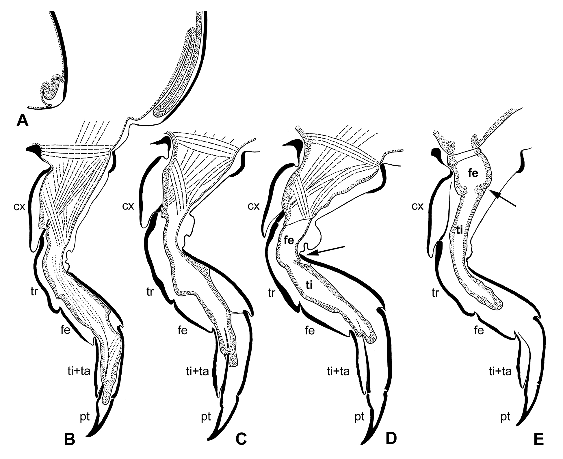 Рис. 10.2.7. Трансформация ног при превращении личинки в куколку у мучного хрущака Tenebrio molitor Linnaeus 1758 (Eleuterata-Polyphaga). A–E – пронимфы последовательных фаз развития, оптические срезы груди и ноги (оптический срез личиночной кутикулы показан черным; оптический срез гиподермы показан пунктировкой; функционирующие поперечно-полосатые мышцы показаны прерывистыми линиями; нефункционирующие остатки мышц показаны точечными линиями): A – срез участка среднегруди с зачатком протоптерона; B – срез участка среднегруди с зачатком протоптерона и средней ногой; C и D – срез передней ноги разных экземпляров в последовательных фазах развития; E – срез средней ноги в следующей фазе развития. Условные обозначения: cx – тазик; fe – бедро; ppt – зачаток куколочного протоптерона; pta – претарсус; ta – лапка; ti – голень; tr – вертлуг; жирным шрифтом обозначены членики зачатка куколочной ноги; светлым шрифтом обозначены кутикулярные членики личиночной ноги; стрелка указывает положение коленного сочленения у будущей куколочной ноги. Объяснение – см. Metabola (1Ccδ-1).