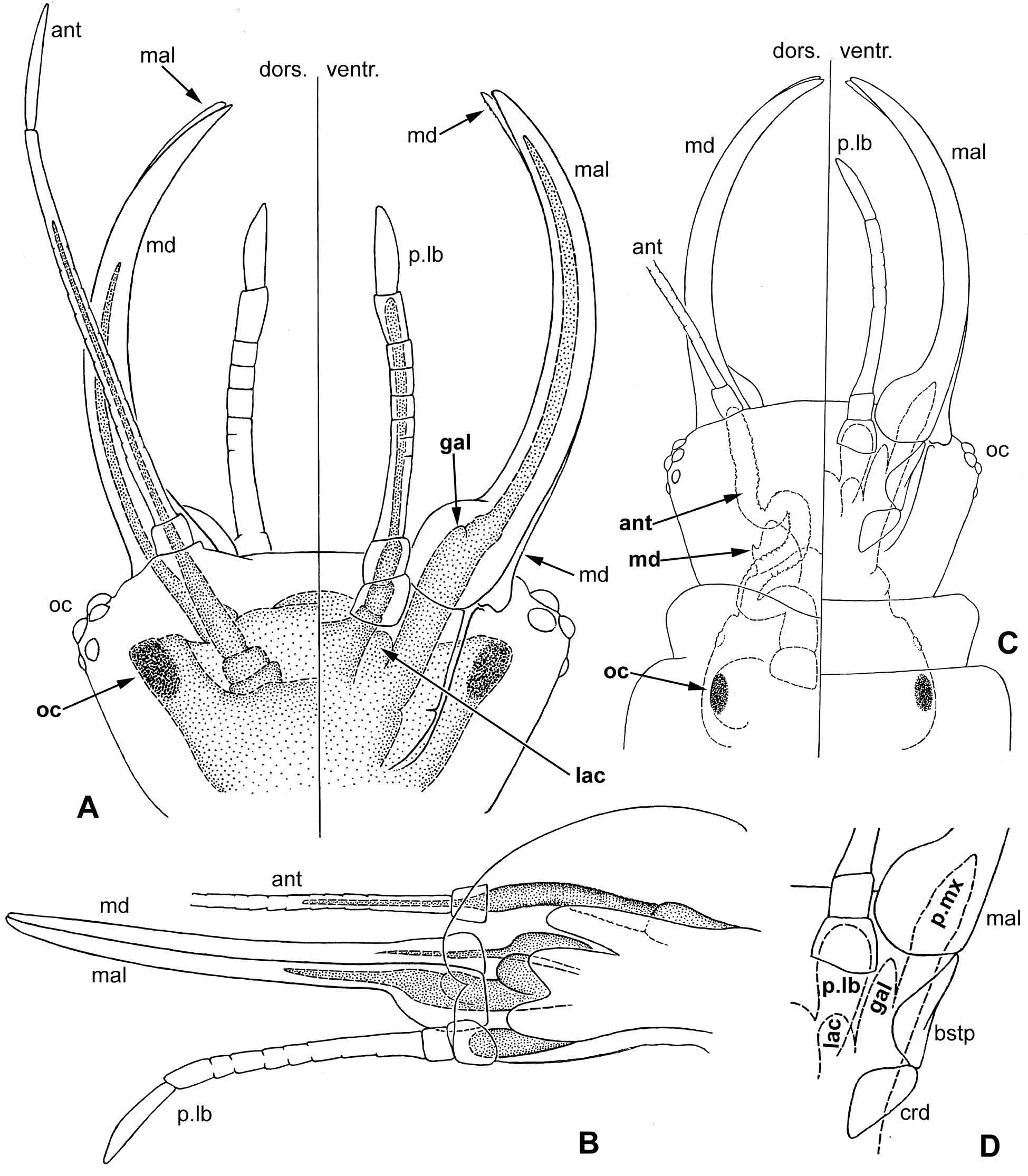 Рис. 10.4.6. Birostrata. Chrysoperla carnea (Stephens 1836 [Chrysopa]): голова пронимфы. A – ранняя фаза (слева – дорсально; справа – вентрально; личиночная кутикула показана как бесцветная; поверхность гиподермы пунктирована, скрытые части гиподермы показаны прерывистой линией); B – более поздняя фаза (левая половина головы, вид с медиального среза; личиночная кутикула показана как бесцветная; поверхность гиподермы пунктирована, скрытые части гиподермы показаны прерывистой линией); С–D – еще более поздняя фаза (слева – дорсально; справа – вентрально; сплошные линии – личиночная кутикула; прерывистые линии – гиподерма, приобретающая форму будущей куколочной головы и ее придатков; имагинальные глаза пунктированы). Условные обозначения: ant – антенна; gal – будущая куколочная галеа; lac – будущая куколочная лациния; mal – максиллярная мала (результат слияния дистальной части стипеса, лацинии, галеи и щупика); md – мандибула; oc – глаз (личиночный и имагинальный); p.lb – лабиальный щупик; p.mx – будущий куколочный максиллярный щупик; жирным шрифтом обозначены будущие куколочные части, светлым шрифтом обозначены кутикулярные части личинки.