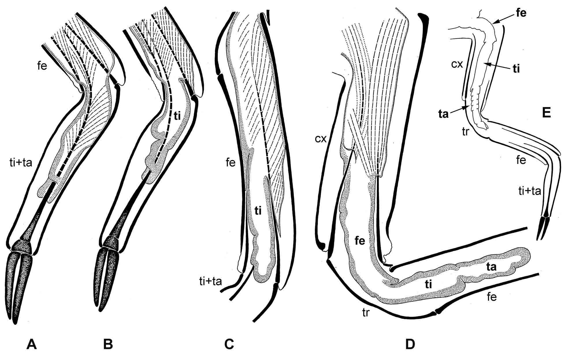Рис. 10.4.8. Birostrata. Трансформация ноги при превращении личинки в куколку у муравьиного льва Myrmeleon bore (Tjeder 1941 [Grocus]). Оптический срез задней ноги разных экземпляров в последовательных фазах развития (срез толстой гиподермы пунктирован, действующие мышцы показаны прерывистыми линиями): A–B – вершина бедра и тибиотарсус (тазик и бедро еще сохраняют личиночное строение с действующими мышцами); C – бедро (тазик еще сохраняет личиночное строение с действующими мышцами, тибиотарсус уже пустой); D – тазик, вертлуг и основание бедра (большая часть бедра и тибиотарсус уже пустые); E – нога целиком с меньшим увеличением. Условные обозначения: cx – тазик; fe – бедро; ta – лапка; ti – голень; tr – вертлуг; жирным шрифтом обозначены членики зачатка куколочной ноги; светлым шрифтом обозначены кутикулярные членики личиночной ноги. Объяснение – см. Metabola (1Ccδ-5).
