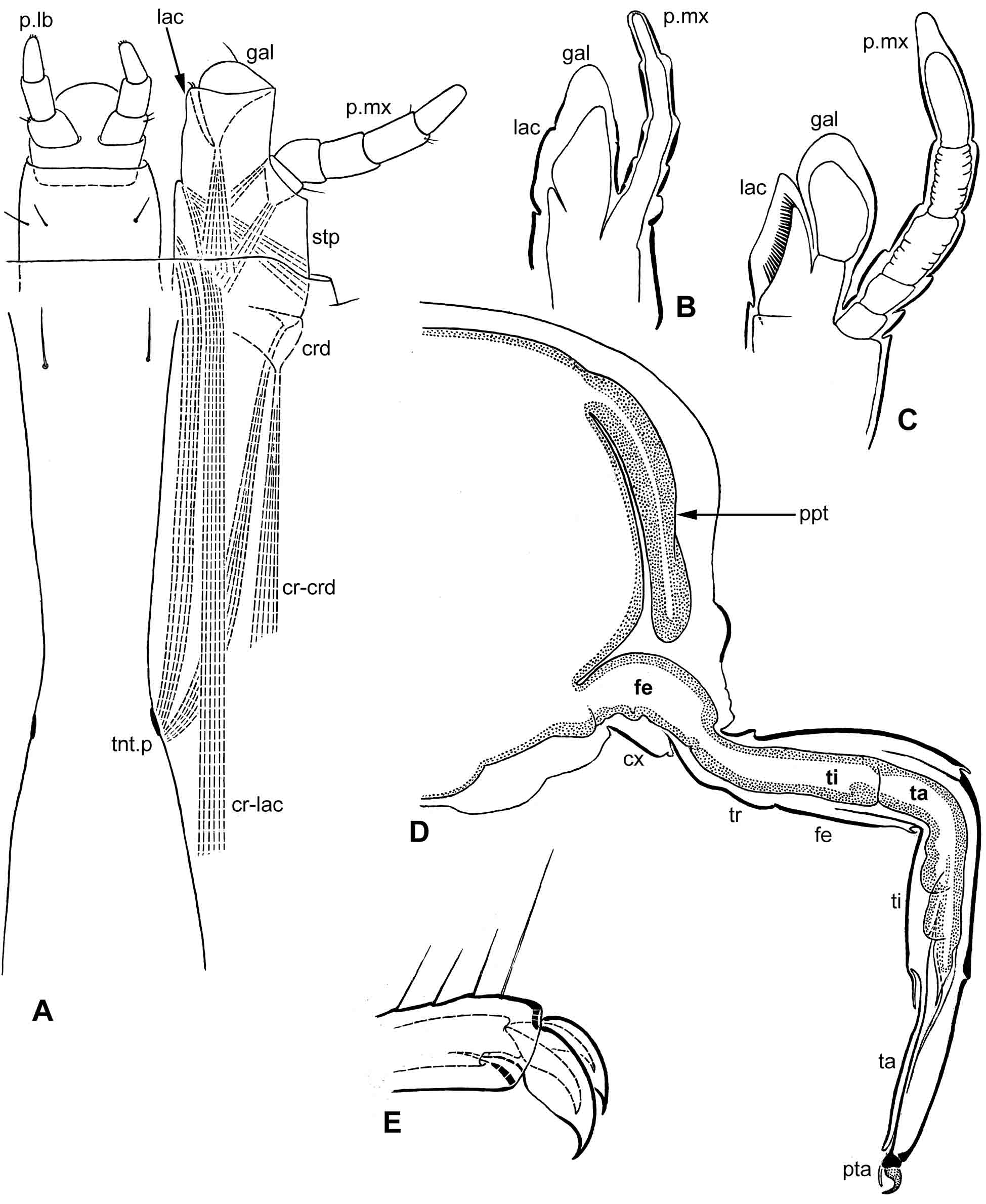 Рис. 10.5.3. Rhaphidioptera: Raphidia spp. A – часть головы личинки, вентрально; галеа частично втянута в стипес, кардо и основание стипеса втянуты в голову (максиллярные мышцы и скрытые части максиллы показаны прерывистыми линиями; другие мышцы не нарисованы); B – оптический срез пронимфальной максиллы (черное – оптический срез личиночной кутикулы; тонкая линия – очертания гиподермы, приобретающей форму будущей куколочной максиллы); C – оптический срез куколочной максиллы (черное – оптический срез куколочной кутикулы; тонкая линия – очертания имагинальной максиллы, развивающейся внутри); D – Raphidia xanthostigma Schummel 1832: оптический срез правой половины заднегруди пронимфы (срез личиночной кутикулы показан черным; гиподерма показана тонкой линией и пунктировкой; объяснение – см. Metabola (1Ccδ-6); E – последний членик лапки и претарсус куколки в фазе фаратного имаго (имагинальные части, находящиеся под куколочной кутикулой, показаны прерывистой линией). Условные обозначения: cr-crd – мышца от краниума к кардо максиллы; cr-lac – мышца от краниума к лацинии максиллы; crd – кардо максиллы; cx – тазик; fe – бедро; gal – галеа максиллы; lac – лациния максиллы; p.lb – лабиальный щупик; p.mx – максиллярный щупик; ppt – протоптерон; pta – претарсус; stp – стипес максиллы; ta – лапка; ti – голень; tnt.p – задняя тенториальная ямка; tr – вертлуг.