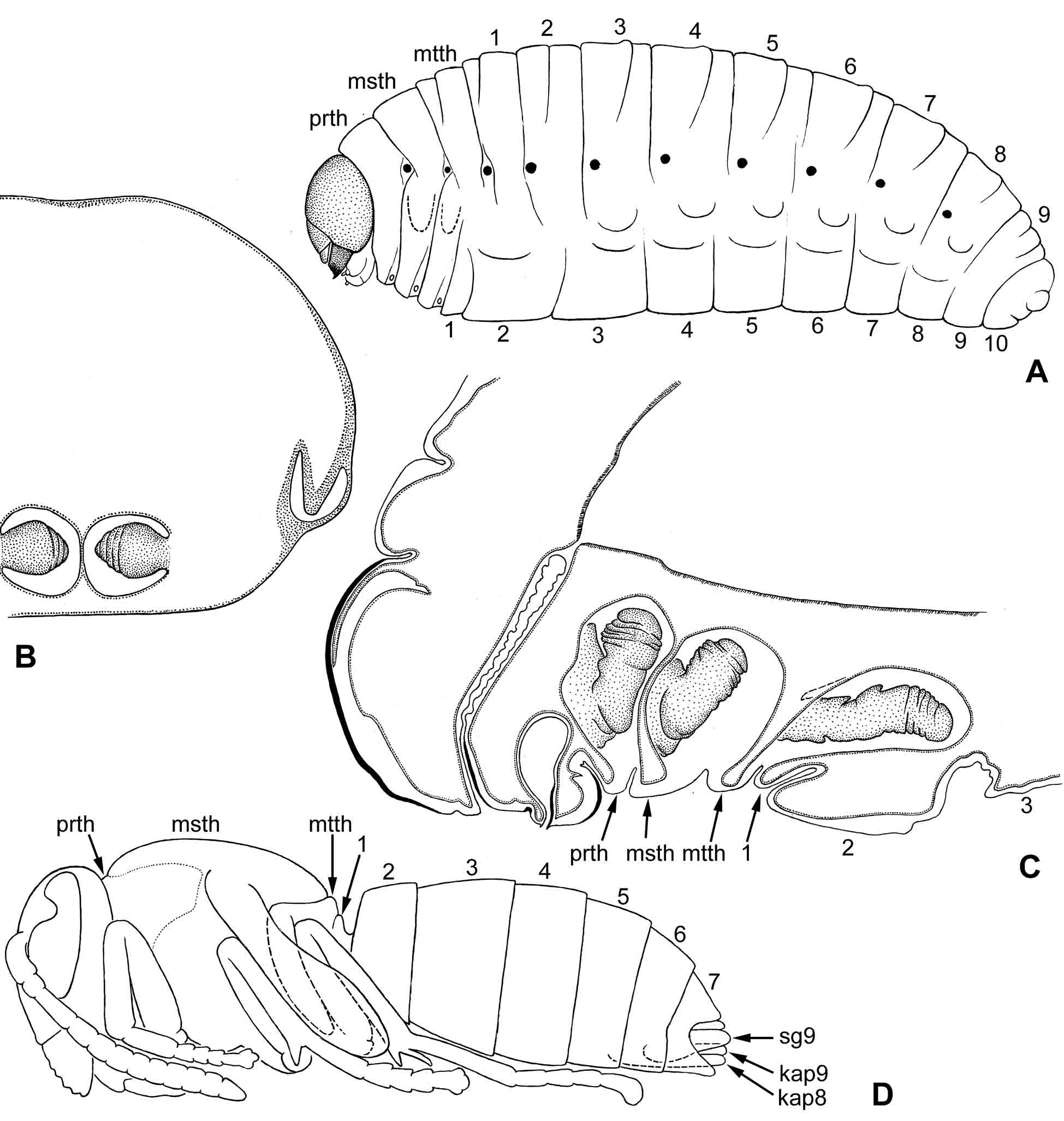 Ðèñ. 10.7.4. Hymenoptera: Apocrita: Dolichovespula sylvestris (Scopoli 1763 [Vespa]). A – ëè÷èíêà (ïðåðûâèñòûìè ëèíèÿìè ïîêàçàíû ìåñòà ðàñïîëîæåíèÿ âíóòðåííèõ çà÷àòêîâ ïðîòîïòåðîíîâ, ïîêàçàííûõ íà ðèñ. B); B – ïèòàþùàÿñÿ ëè÷èíêà ïîñëåäíåãî âîçðàñòà, ïîïåðå÷íûé ðàçðåç ïîëîâèíû çàäíåãðóäè ñ çà÷àòêàìè êóêîëî÷íûõ íîã è ïðîòîïòåðîíà; C – ëè÷èíêà ïîñëåäíåãî âîçðàñòà â áîëåå ïîçäíåé ôàçå ðàçâèòèÿ, ìåäèàëüíûé ðàçðåç ïåðåäíå-âåíòðàëüíîé ÷àñòè òåëà; D – êóêîëêà ñàìêè. Óñëîâíûå îáîçíà÷åíèÿ: 1–10 – ñåãìåíòû áðþøêà; kap8, kap9, – çà÷àòêè êèíåòàïîôèçîâ VIII è IX (ïåðâûõ è âòîðûõ ñòâîðîê ÿéöåêëàäà); msth – ñðåäíåãðóäü; mtth – çàäíåãðóäü; prth – ïåðåäíåãðóäü; sg9 – çà÷àòîê ñòèëèãåðà IX (òðåòüåé ñòâîðêè ÿéöåêëàäà). Îáúÿñíåíèå – ñì. Metabola (1Ccδ-9).