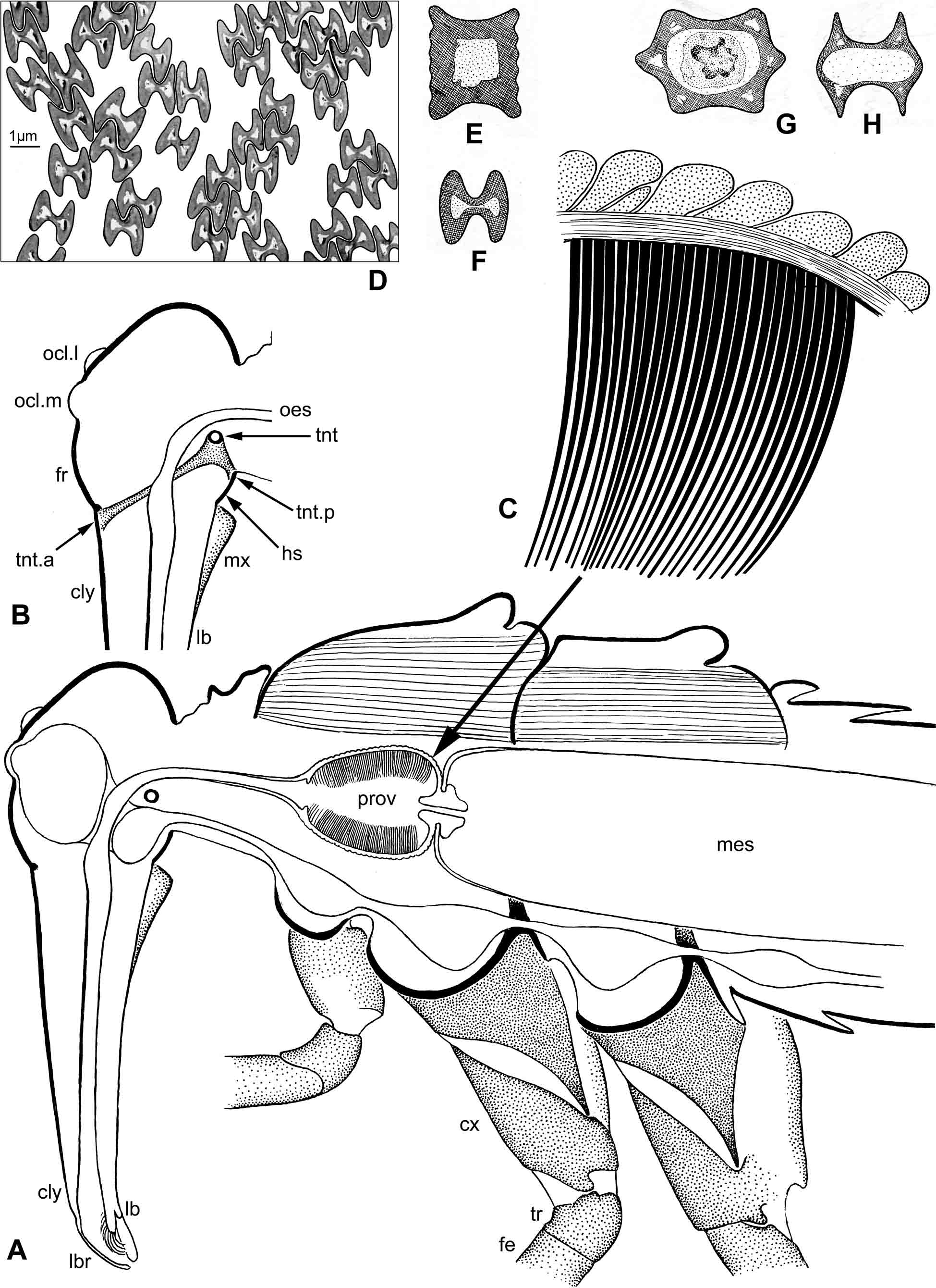 D –H – ïîïåðå÷íûå ñðåçû àêàíò (ïî Richards & Richards 1969): D –F – Panorpa communis: D –E – â àïèêàëüíîé ÷àñòè; F – â áàçàëüíîé ÷àñòè; G–H – Ctenophthalmus sp. ( Aphaniptera): G – â áàçàëüíîé ÷àñòè; H – â àïèêàëüíîé ÷àñòè. Óñëîâíûå îáîçíà÷åíèÿ: cly – êëèïåóñ; cx – òàçèê; fe – áåäðî; fr – ëîá; hs – ãèïîñòîìàëüíûé ìîñò; lb – íèæíÿÿ ãóáà; lbr – âåðõíÿÿ ãóáà; mes – ïîëîñòü ñðåäíåé êèøêè; mx – êàðäî è îñíîâàíèå ñòèïåñà ìàêñèëëû; ocl.l – ëàòåðàëüíûé ïðîñòîé ãëàçîê; ocl.m – ìåäèàëüíûé ïðîñòîé ãëàçîê; oes – ïèùåâîä; prov – ïîëîñòü ïðîâåíòðèêóëþñà; tnt – ñðåç çàäíåãî òåíòîðèàëüíîãî ìîñòà; tnt.a – ïåðåäíÿÿ òåíòîðèàëüíàÿ ÿìêà; tnt.p – çàäíÿÿ òåíòîðèàëüíàÿ ÿìêà; tr – âåðòëóã.