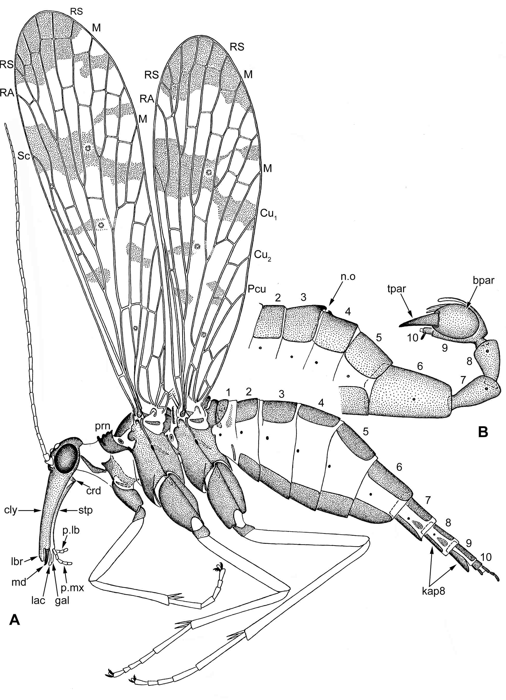 Ðèñ. 10.9.1. Scorpiomuscae: èìàãî Panorpa communis Linnaeus 1758. A – ñàìêà; B – áðþøêî ñàìöà. Óñëîâíûå îáîçíà÷åíèÿ: 1–10 – ñåãìåíòû áðþøêà; bpar – áàçèïàðàìåð; cly – êëèïåóñ; crd – êàðäî ìàêñèëëû; gal – ãàëåà ìàêñèëëû; kap8 – ñêëåðèòû, îáðàçîâàâøèåñÿ èç êèíåòàïîôèçîâ VIII óðîìåðà; lac – ëàöèíèÿ ìàêñèëëû; lbr – âåðõíÿÿ ãóáà; md – ìàíäèáóëà; n.o – íîòàëüíûé îðãàí; p.lb – ëàáèàëüíûé ùóïèê; p.mx – ìàêñèëëÿðíûé ùóïèê; prn – ïðîíîòóì; stp – ñòèïåñ ìàêñèëëû; tpar – òåëîïàðàìåð.
