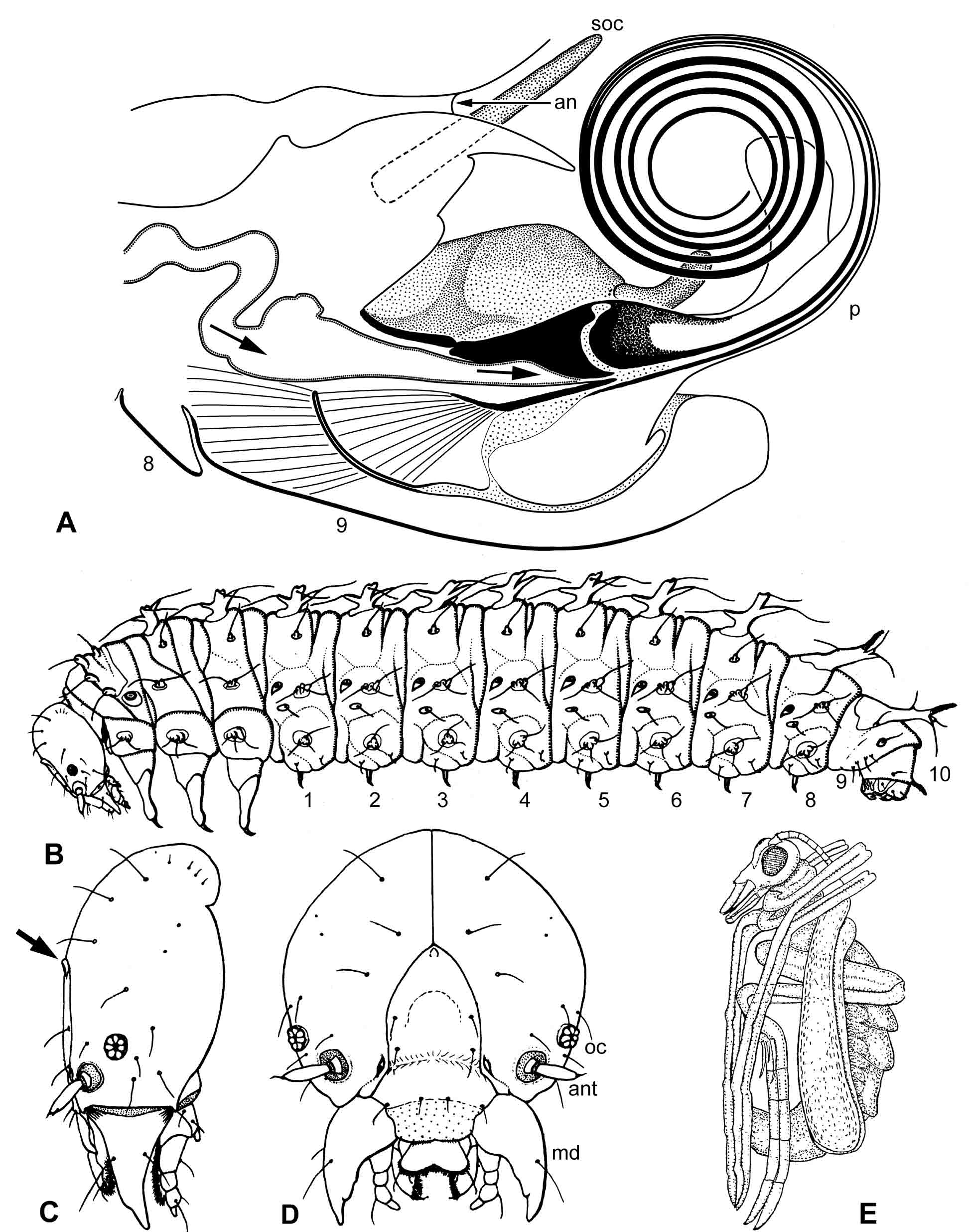 Ðèñ. 10.10.2. Metamecoptera. A – Bittacus cirratus Tjeder 1956, ãåíèòàëèè ñàìöà, ìåäèàëüíûé ðàçðåç (áîëüøèå ñòðåëêè ïîêàçûâàþò íàïðàâëåíèå äâèæåíèÿ ñïåðìû). B–D – ëè÷èíêà Apterobittacus apterus (MacLachlan 1871 [Bittacus]) (ïî Applegarth 1939), ñòðåëêà óêàçûâàåò íà áóãîðîê, îøèáî÷íî ïðèíèìàâøèéñÿ çà çà÷àòîê ìåäèàëüíîãî ãëàçêà; E – Harpobittacus tillyardi Esben-Petersen 1915, êóêîëêà (ïî Currie 1932). Óñëîâíûå îáîçíà÷åíèÿ: 1–10 – ñåãìåíòû áðþøêà; an – àíàëüíîå îòâåðñòèå; ant – àíòåííà; md – ìàíäèáóëà; oc – ãëàç, ñîñòîÿùèé èç 7 ñòåìì; p – ïåíèñ; soc – ñîöèÿ.