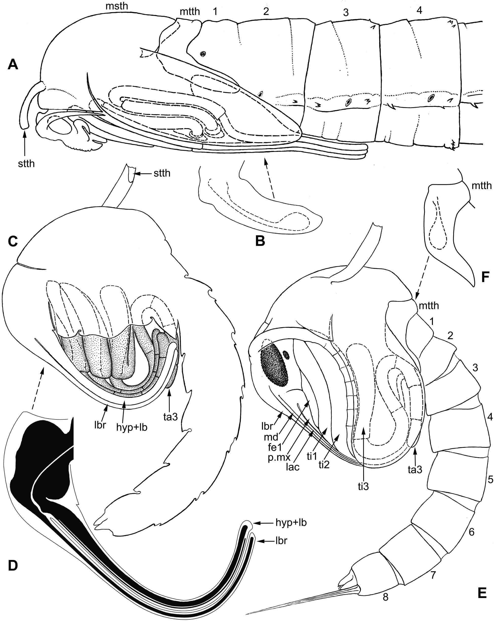 Ðèñ. 10.14.5. Diptera: êóêîëêè. A–B – Tipula (Emodotipula) obscuriventris Strobl 1900; C–F – ñàìêà êîìàðà Culex pipiens Linnaeus 1758: A, E – ëàòåðàëüíî (ñêðûòûå ÷àñòè òóëîâèùà, íîã è çàäíåãî ïðîòîïòåðîíà ïîêàçàíû ïðåðûâèñòîé ëèíèåé); B, F – çàäíèé ïðîòîïòåðîí (ðàçâèâàþùååñÿ æóææàëüöå èìàãî ïîêàçàíî ïðåðûâèñòîé ëèíèåé); C – ìåäèàëüíûé ñðåç; D – ìåäèàëüíûé ñðåç ãîëîâû (÷åðíûì ïîêàçàíà ðàçâèâàþùàÿñÿ ãîëîâà èìàãî). Óñëîâíûå îáîçíà÷åíèÿ: 1–8 – ñåãìåíòû áðþøêà; fe1 – áåäðî ïåðåäíåé íîãè; hyp+lb – îáùèé çà÷àòîê íèæíåé ãóáû è ãèïîôàðèíêñà; lac – ëàöèíèÿ ìàêñèëëû; lbr – âåðõíÿÿ ãóáà; md – ìàíäèáóëà; msth – ñðåäíåãðóäü; mtth – çàäíåãðóäü; p.mx – ìàêñèëëÿðíûé ùóïèê; stth – ñòåíîòîðàêàëüíîå äûõàëüöå íà âåðøèíå äûõàòåëüíîé òðóáêè; ti1, ti2, ti3 – ãîëåíè ïåðåäíåé, ñðåäíåé è çàäíåé íîãè; ta3 – âåðøèíà ëàïêè çàäíåé íîãè.