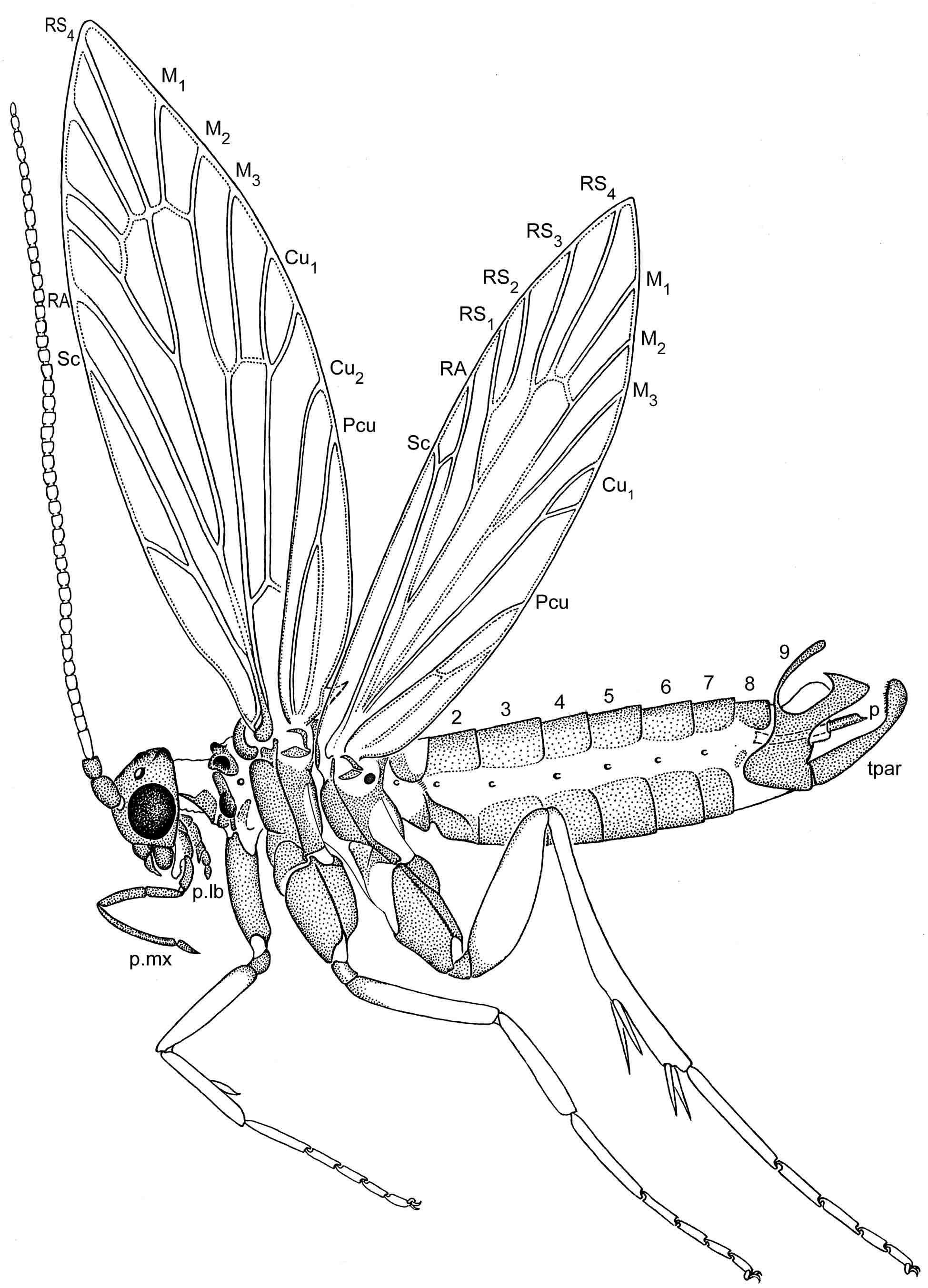 Ðèñ. 10.16.1. Lepidoptera-Protolepidoptera: Micropteryx aruncella (Scopoli 1763 [Phalaena]). Ñàìåö èìàãî, ëàòåðàëüíî. ×åøóéêè è ùåòèíêè íå ïîêàçàíû. Óñëîâíûå îáîçíà÷åíèÿ: 1–9 – ñåãìåíòû áðþøêà; p – ïåíèñ; p.lb – ëàáèàëüíûé ùóïèê; p.mx – ìàêñèëëÿðíûé ùóïèê; tpar – òåëîïàðàìåð.